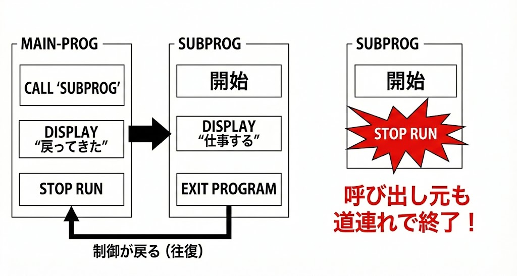 CALLは「必ず戻る」ことが前提の、往復チケット付きの命令だ。EXIT PROGRAMは“サブとしての仕事を終えて返る”という立場を示す出口になる。GOBACKは万能だが、そのぶん「このプログラムの役割」を曖昧にする。STOP RUNは最上位だけの終業ベルで、サブで鳴らすと全員帰宅だ。