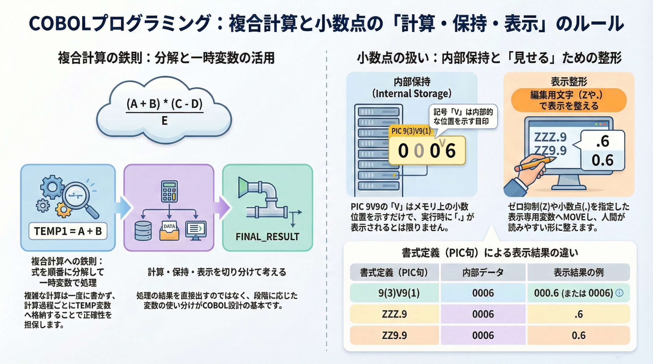 だからこそ、人間に正しく見せるための「表示用の変数(PIC ZZZ.9)」をちゃんと作っておくのが大事なんだ。